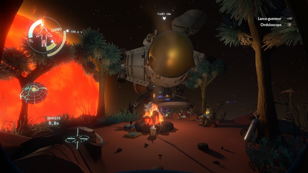 On incarne un autochtone à 4 yeux issu d’une petite planète forestière modeste, mais qui a réussi à mettre en place un programme d’exploration spatial ! Quelques pioniers se sont déjà aventuré dans le vide stellaire, et on va donc suivre leur trace. Je me réveille à la belle étoile, à côté d’un feu de camp… Après avoir englouti quelques chamalows grillés, je pars en quête des codes de lancement de notre fusée de fortune, faite de bric et de broc. Un court prologue qui fait office de petit tutorial… Et puis cette fois ça y est, je suis prêt à partir pour percer les mystères de notre galaxie, et de cette ancienne civilisation, les Nomaï qui ont laissé des vestiges et des artefacts dans notre Galaxie.