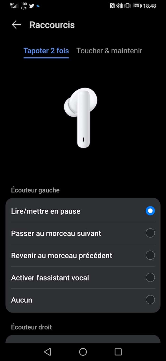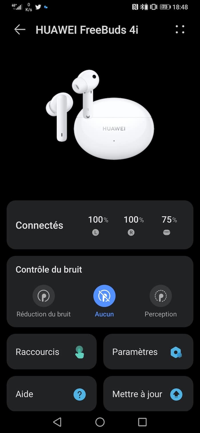 Au niveau de la qualité sonore, j’ai couplé (en Bluetooth 5.2) les écouteurs à mon Huawei P30 Pro, qui fait tourner Spotify (en qualité maximum). Le résultat est tout à fait satisfaisant pour des True Wireless de cette gamme de prix. Je ne suis pas un expert, mais j’ai trouvé l’écoute équilibrée dans la plupart des styles musicaux testés (rock, électro, hip-hop…), malgré un certain manque dans les graves. L’absence d’APT-X se fait sentir, mais le rendu général reste précis, agréable, avec un beau détaché des mediums et aigus. Au niveau de la gestion des écouteurs, l’application Ai Life de Huawei propose quelques options assez simples, comme la définition de raccourcis tactiles sur les écouteurs (taper 1 fois ou 2 fois pour déclencher une commande), l’activation de l’ANC, la mise à jour firmware.