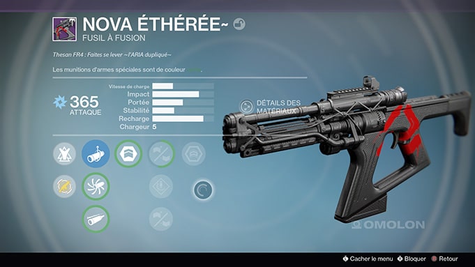 J’ai également choppé la coque du Raid, ainsi que le fusil automatique Chaine de la Génèse (un Suros !!) noir vraiment top ! Un des seuls à disposer du perk Luciole ! Le fusil à fusion Nova éthérée est également tombé, assez moyen.