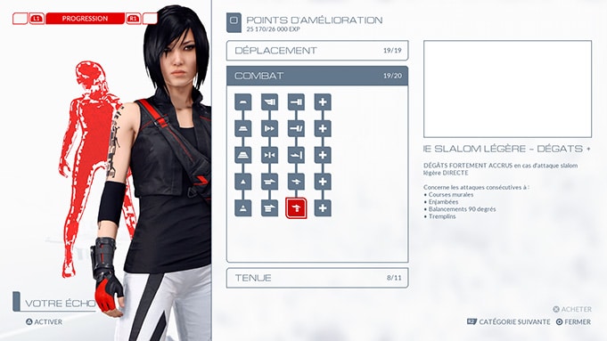 Au fil des missions accomplies, notre héroïne gagne de l’expérience et des niveaux débloquant des points à attribuer dans 3 arbres de compétences (Déplacements, Combats, Tenues), lui permettant de débloquer de nouveaux mouvements ou aptitudes de combats ! Car oui, dans Mirror’s Edge il y’a des combats ! Et ce n’est toujours pas la partie la plus réussie du jeu. Les différents coups sont basiques, et même si quelques clés de bras sophistiquées sont plutôt agréables à exécuter, les agents de Kruger Sec n’opposent pas vraiment de résistance. On préférera d’ailleurs fuir les combats la plupart du temps (entrainant une sorte de course poursuite comme dans un GTA), et ainsi rester en mouvement afin de remplir une jauge nous rendant insensible aux balles et aux coups.