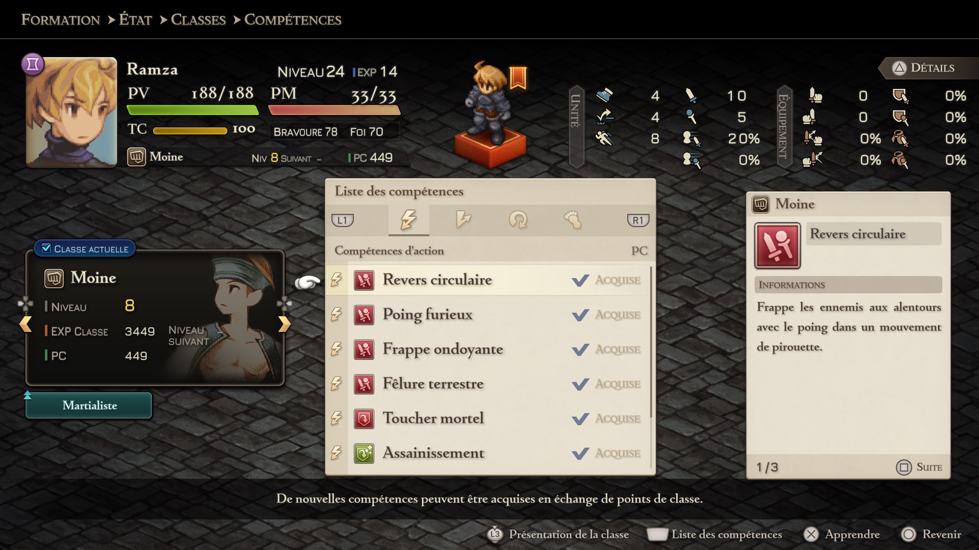 Le cœur de Final Fantasy Tactics, c’est évidemment son système de jobs. Et là encore, The Ivalice Chronicles élève le tout à un niveau supérieur. L’arbre de progression a été revu pour être plus lisible, sans perdre la richesse infinie des combinaisons possibles. On jongle entre chevaliers, mages, voleurs, chevaliers dragon et chaque évolution de classe devient une petite aventure en soi.
