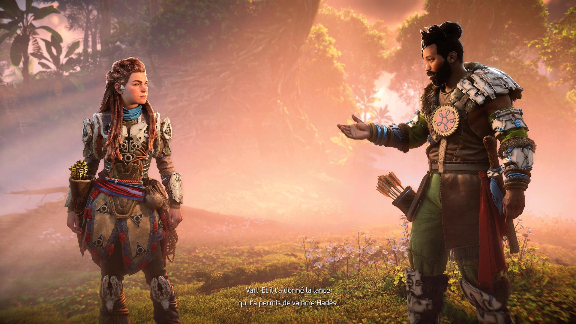 Guerrilla a usé d’une astuce pour faire ressortir artificiellement Aloy et d’autres personnages, pour flatter la rétine des joueurs : ils utilisent un éclairage quasiment permanent sur les personnages, avec en prime un détourage de lumière autour d’eux pour les faire ressortir. Cela créer trop souvent un effet « Fond Vert », et une impression de lumière studio pas du tout naturelle, qui jure bien souvent avec l’environnement. Cela m’a gêné, et je trouve cela dommage que le studio utilise une telle approche. Le jeu est déjà ultra saturé en couleurs, et autre « grain » et « netteté » pour affiner et embellir l’image au maximum,, je trouve qu’ils auraient du se passer du procédé de sur-éclairage, qui fait vraiment tâche par moment, je vous laisse juger :
