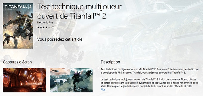 Hier soir, les différents store ne permettaient pas encore de télécharger le client. J’ai vérifié tout à l’heure et c’est bon ! Sur Xbox One, il suffit de se rendre sur le Marché, (ou directement sur le site Xbox Live, puis de rechercher « Test technique Titanfall 2 »