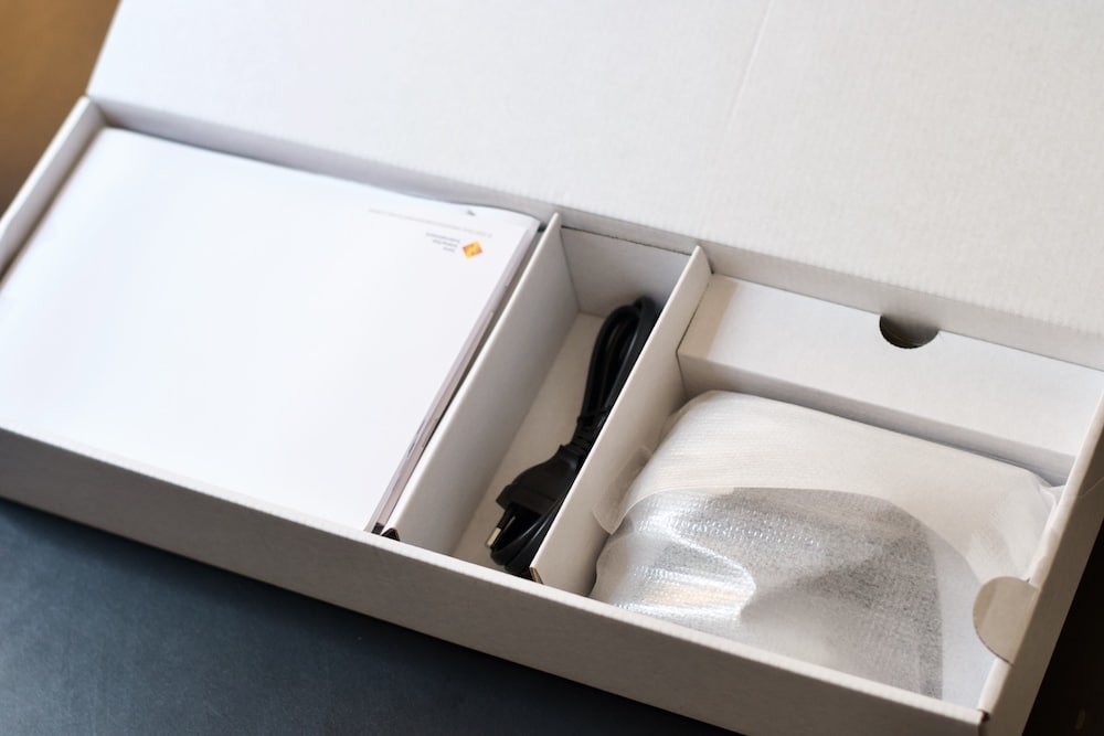 Tout d’abord on trouve le compartiment pour les câbles et accessoires : alimentation, HDMI 2.1 (1m50… BEAUCOUP trop court !), câble USB-C, manette Dualsense et le fameux socle de maintient de la console.