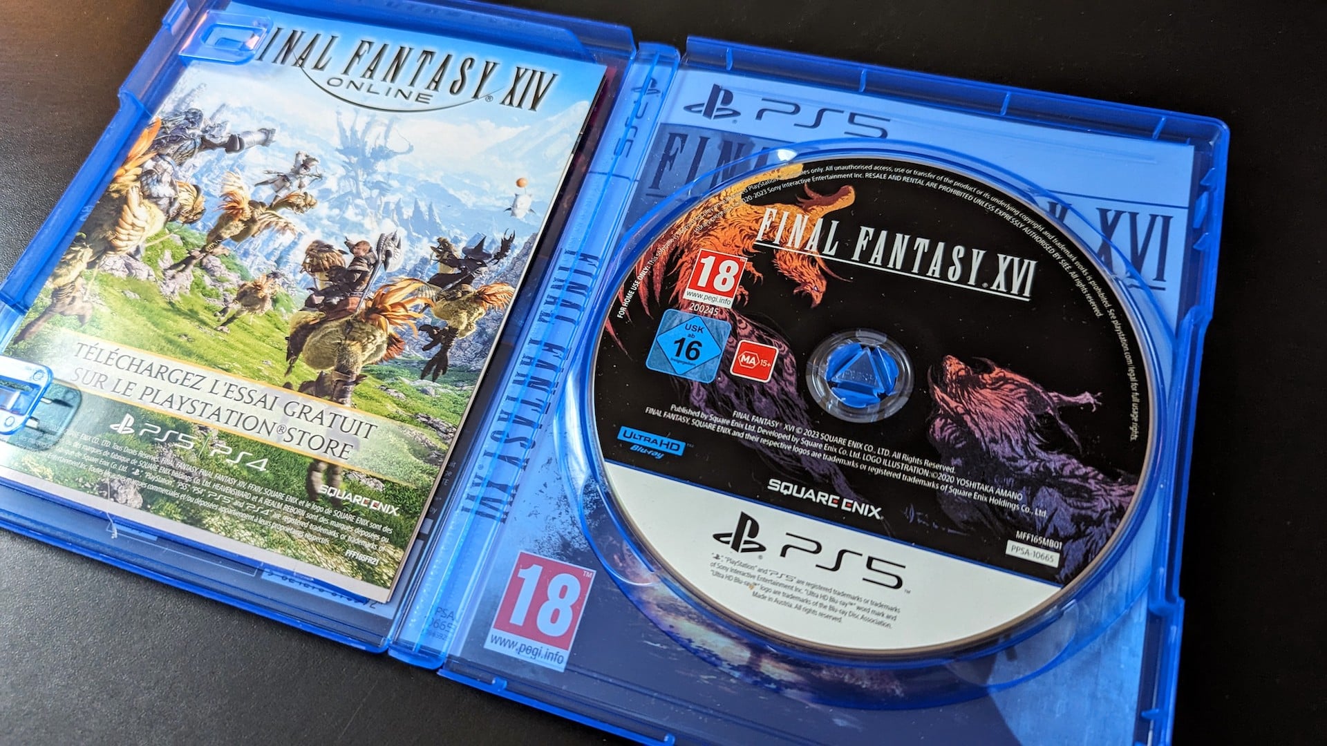 (Avant toute chose, il faut savoir que l’édition collector de FF16, est en fait un kit : elle comprend d’un côté le jeu standard sur PS5, et de l’autre une édition collector exclusive au store Square Enix. Le jeu n’est pas à l’intérieur.) La boite est sublime. Il n’y a pas d’autres mots. Le visuel des primordiaux réalisé par le maitre Yoshitaka Amano est somptueux.