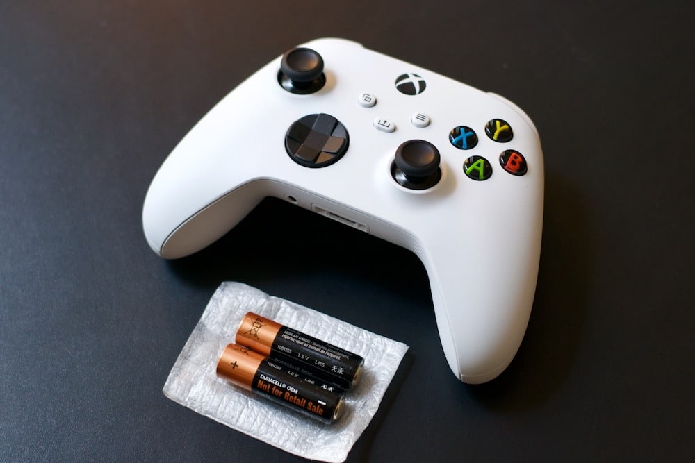 Oui, la manette Xbox est fournie avec des piles. L’éternel débat. Microsoft laisse le choix aux joueurs de mettre ce qu’ils veulent dans leurs manettes (piles rechargeables, batteries, etc), de façon 100% amovible. Je préfère cela, qu’une batterie inamovible intégrée, de piètre autonomie. En l’occurence, sachez que la batterie officielle Xbox One que j’ai achetée en 2013 et qui tient encore plus de 15 heures sans problème, est compatible ;) A l’intérieur du capot, le traditionnel message « Hello From Seattle ».