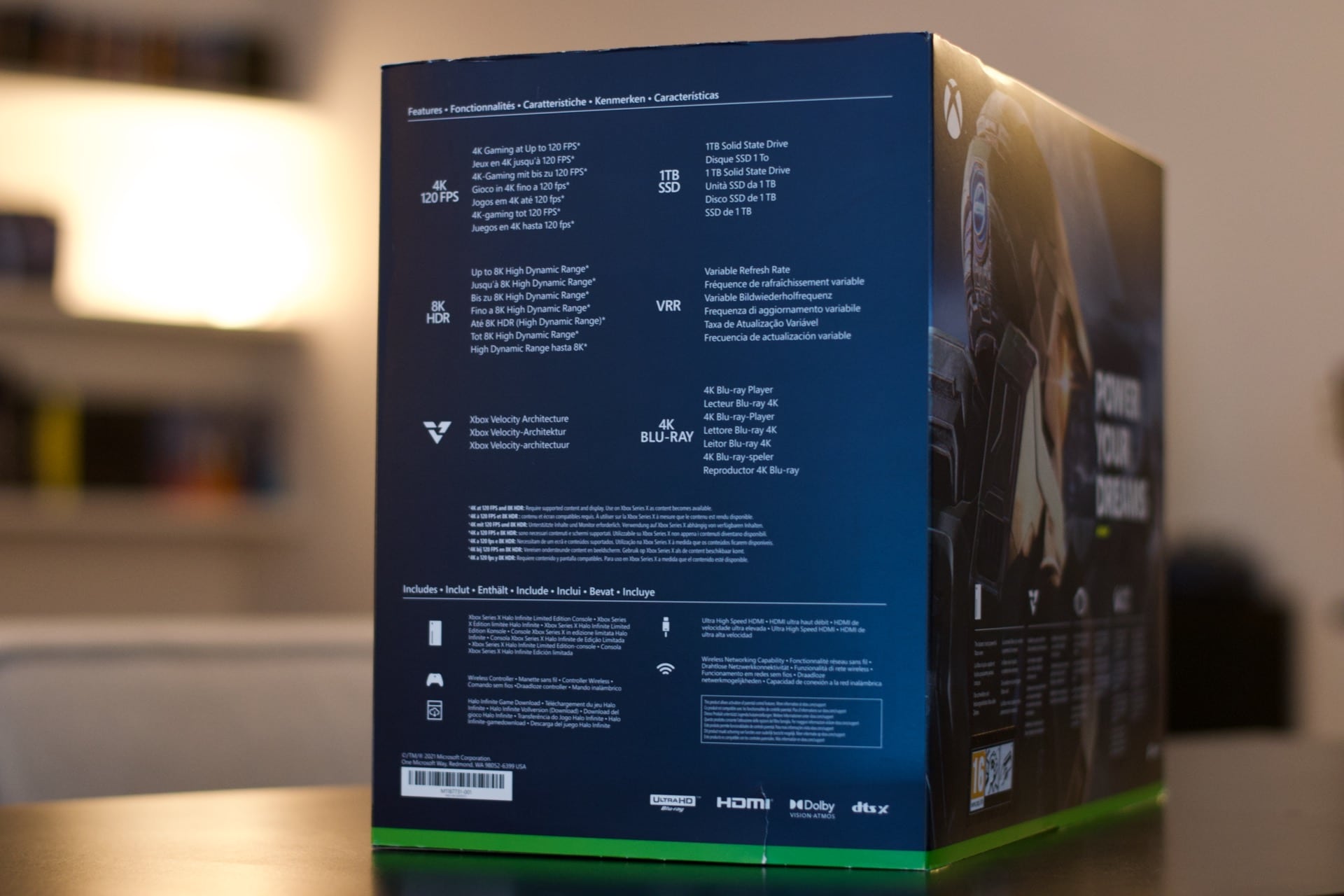 On commence donc par la Xbox Series X Halo Infinite. Comme d’habitude chez Xbox, le packaging est ultra soigné, et fait partie intégrante du collector. Le sleeve qui entoure la boite propose un visuel de la console avec le Master Chief en arrière plan. Le dos est parfaitement identique à la boite de la console standard, et on retrouve sur les côtés les différentes technologies au coeur de la XSX : VRR, 4K 120 FPS, Velocity Architecture etc..