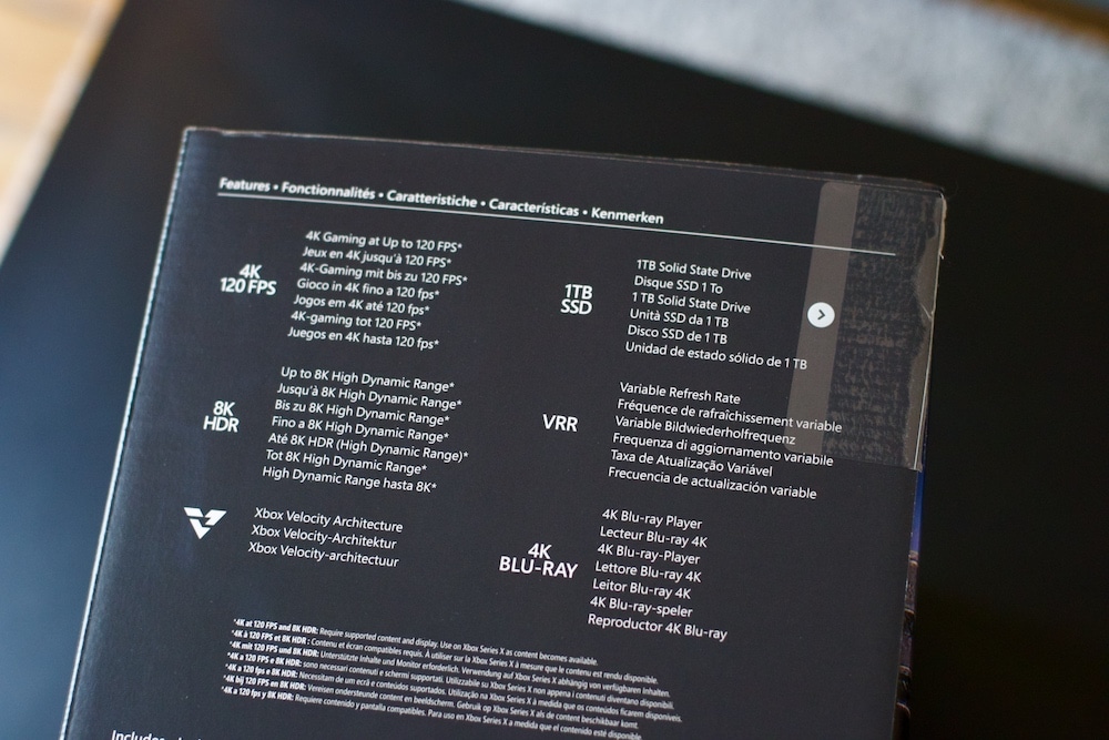 La boite est sobre, et reprend en visuel frontal le haut de la console, extrêmement identifiable avec la grille d’aération et la vouleur verte. Sur les bords, la photos de la console, et les inscriptions 1TB SSD, VRR, Velocity Architecture, 4K 120FPS, jusquà 8K, et Blu-Ray Disc 4K (contrairement à sa petite soeur).